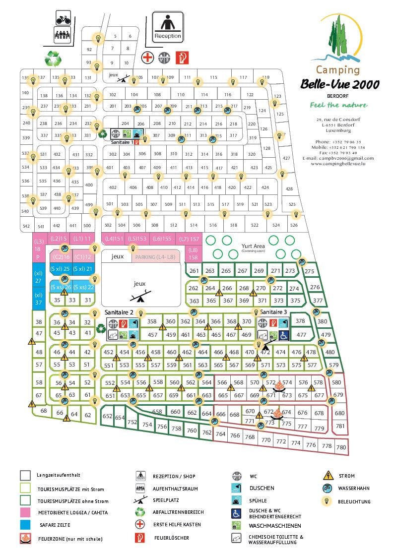 Die Standplätze des Camping Belle-Vue 2000 erstrecken sich auf einem ebenen Wiesengelände mit einigen parzellierenden Hecken und Bäumen. Weite Wiesen und Wälder umrahmen den Campingplatz und bieten beste Voraussetzungen für ausgedehnte Spaziergänge. Die Region ist vor allem beliebt bei Radausflüglern, die die typisch schroffen Felsenlandschaften inmitten der Wälder des Müllerthals erkunden möchten. Ebenso lohnt sich ein Ausflug in das 6 km entfernte Echternach als nächstgrößere Stadt mit vielen Einkaufsmöglichkeiten und Restaurants sowie einem sehenswerten mittelalterlichen Stadtkern.