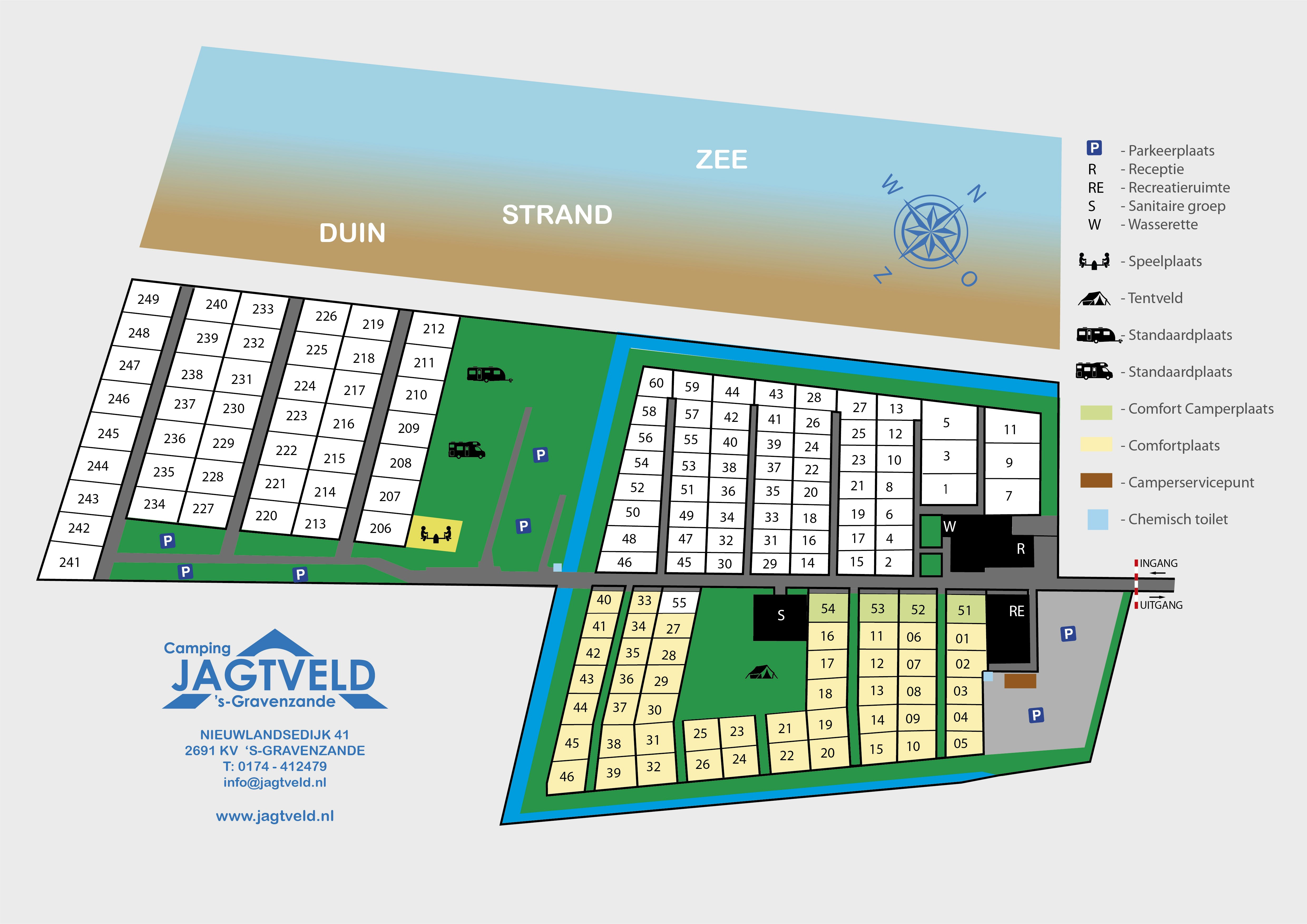 Ebenes Wiesengelände, durch Baumreihen, Büsche und Hecken unterteilt. An Gewächshäuser, Dünen und Deich angrenzend. Für Touristen auch Standplätze ohne Bepflanzung.