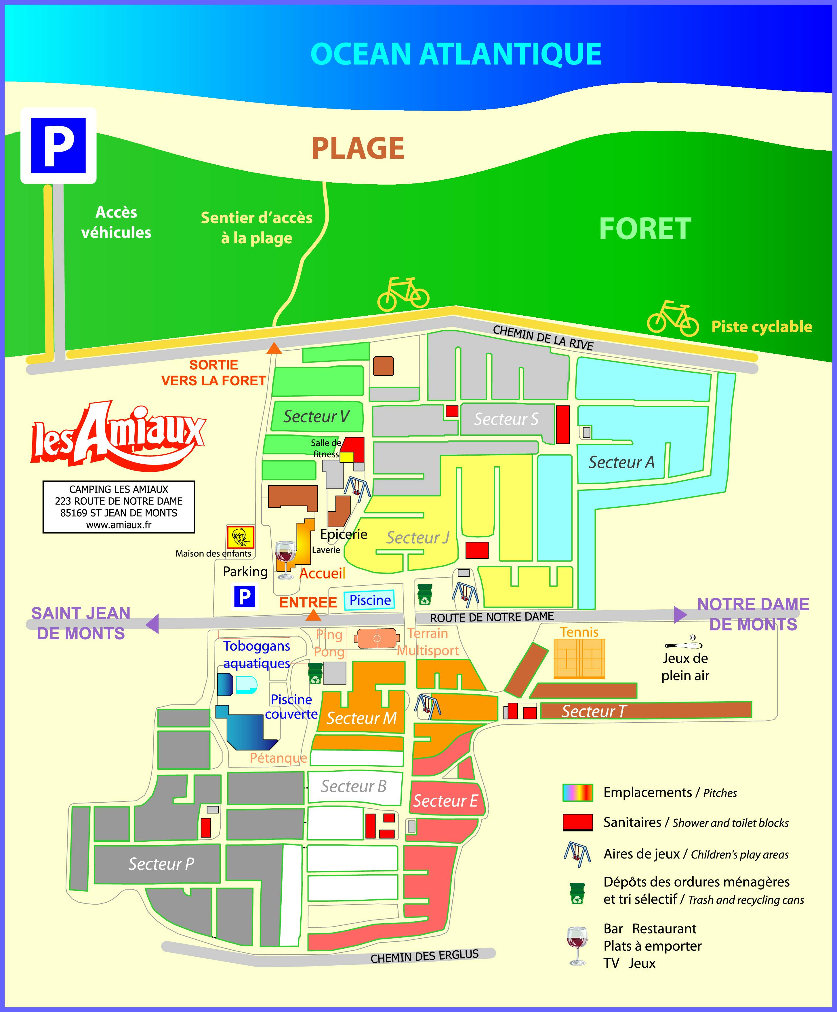 Ein Ferienspot, der keine Wünsche offenlässt, ist der Campingplatz Camping Les Amiaux an der französischen Côte de Lumière nahe dem beliebten Badeort Saint-Jean-de-Monts. Die Attraktion des Platzes rund 5 km nördlich von Saint-Jean-de-Monts ist der nur 800 m entfernte lange Strand Plage de la Parée du Jonc. Die Wellenhöhe ist niedrig und das Meer fällt nur langsam ab. Auch auf dem Gelände lassen mehrere Pools mit Rutschen, Sauna und Kinderanimation keine Langeweile aufkommen. Das Sportangebot reicht von Beachvolleyball und Bogenschießen bis zu Golfen (5 km entfernt) und Fitnesstraining. Eine Gaststätte verwöhnt mit Spezialitäten aus dem Meer. Die private Küche kann im Lebensmittelladen aufgefüllt werden. Ein geschätzter Service ist die VE-Station.