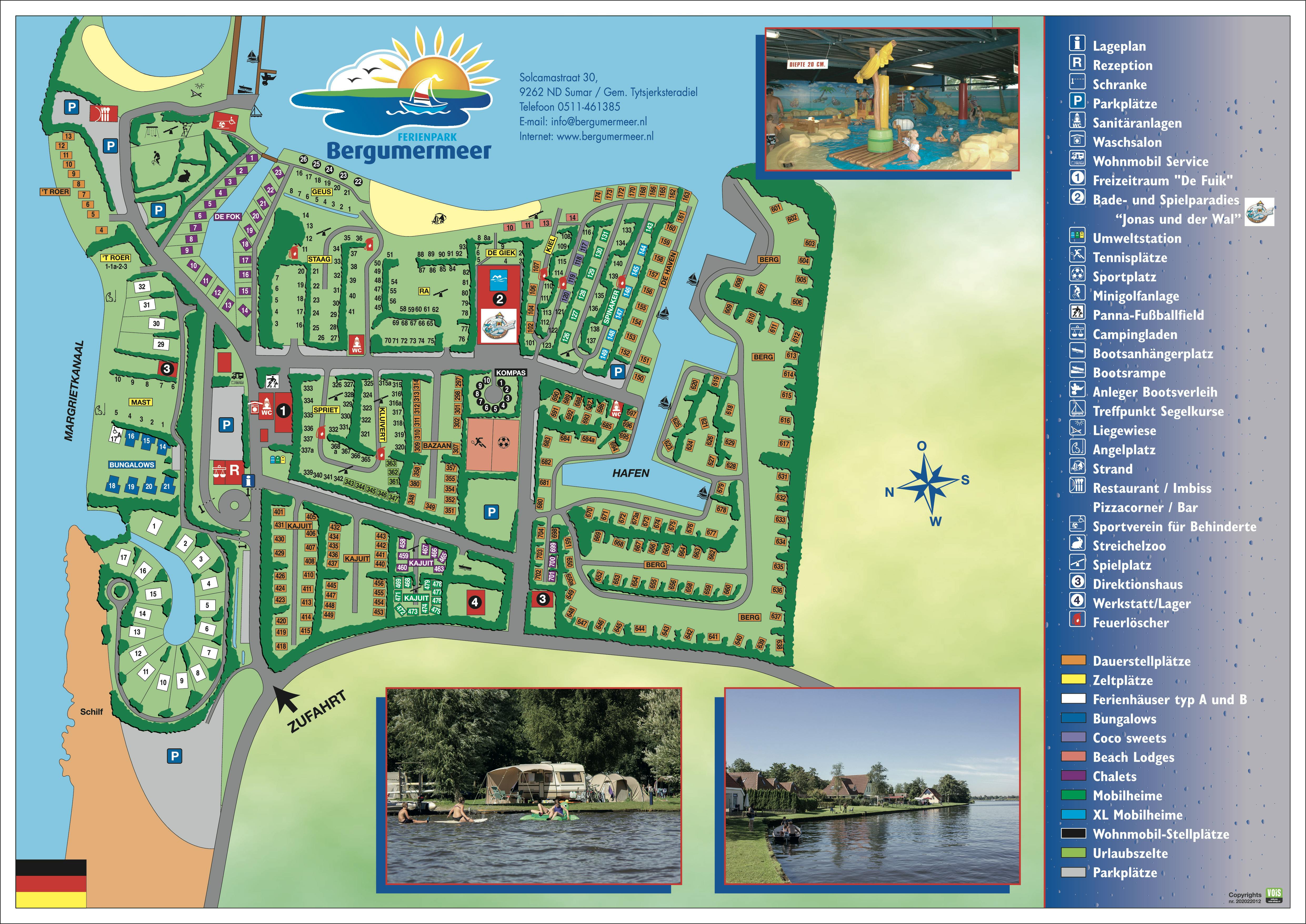 Der Vakantiepark Bergumermeer befindet sich in attraktiver Lage direkt am Seeufer des friesischen Bergumermeers. Das Ortszentrum von Sumar liegt 3,5 km entfernt und ist daher gut mit dem Fahrrad erreichbar. 210 Standplätze für Gäste, die durch kleinere Bäume und Hecken abgegrenzt sind und 100 bis 110 Quadratmeter messen, beherbergt das ebene Wiesengelände. Vielfältige Services rund um das Wohnmobil wie die Entleerung von Kassettentoiletten oder die Gasflaschenversorgung versprechen einen sorgenfreien Campingurlaub in den Niederlanden. Aktive Urlauber freuen sich über die zahlreichen Sportangebote zu Land und zu Wasser. Eine Surf- und Segelschule bietet verschiedene Kurse an, mit einem gemieteten Boot lässt sich die Umgebung aus einer besonderen Perspektive erkunden. Ein Fahrradverleih, ein Tennis- und ein Minigolfplatz zählen ebenfalls zu den Vorzügen des Campingplatzes. Auch an die jüngsten Gäste wurde im Vakantiepark Bergumermeer gedacht. Sie kommen den freundlichen Bewohnern des Streichelzoos näher, amüsieren sich im Kindertheater oder treffen auf dem Spielplatz neue Freunde. Ein eigener Sanitärbereich für die kleinen Camper ist ebenfalls vorhanden. Wer sich selbst verpflegen möchte, findet im Supermarkt Produkte des täglichen Bedarfs. Für ein gemütliches Abendessen zu zweit oder einen Snack zwischendurch sind ein Restaurant und ein Imbiss vorhanden. Beim Unterhaltungsprogramm nehmen die Camper gemeinsam an vielseitigen Aktivitäten teil.