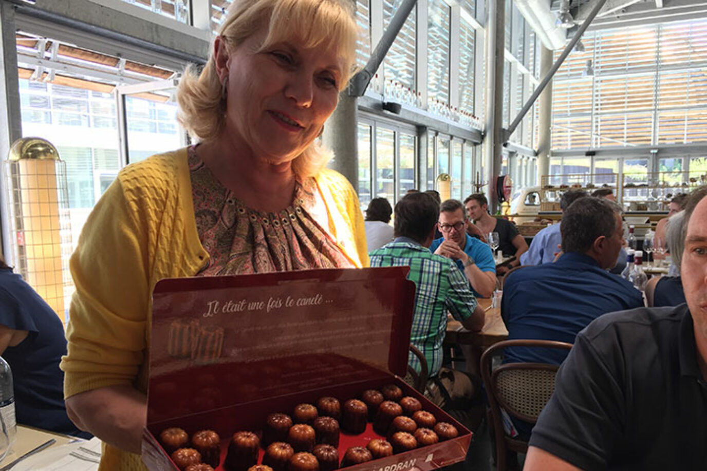 Bevor es zurückgeht, lassen wir uns in den ‚Les Halles de Bacalan‘ von allerlei frischen Waren verführen, die dem eigenen Anspruch nach zu 85 % Sud-Ouest sind, also ausschließlich aus der Region. Trüffel, Austern, Foie gras, Fisch, Fleisch, Wurst, Käse und alle Arten Gemüse und Obst, die Auswahl ist so riesig, dass man einfach probieren muss. In der Brasserie der Markthalle dann eine Überraschung: Canelés, die typischen Minikuchen der Gironde, die als klassische Mitbringsel gelten. Nach dem Biss in die äußere, karamellisierte Schicht entfaltet sich aus dem fluffigen Inneren ein Aroma aus Rum und Vanille. Und wer hätte es gedacht, auch die Canelés haben einer Geschichte nach mit Wein zu tun. Früher verwendeten Winzer zur Trennung der Schwebstoffe im Wein Eiweiß, das als Abfallprodukt aber zu wertvoll war. Der Beginn einer wundervollen Versuchung …