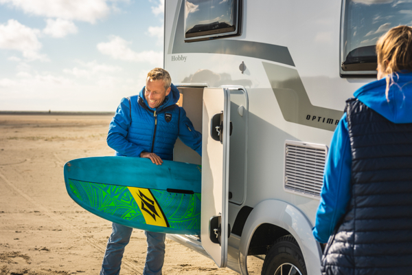 Schon beim Packen in Deutschland fällt auf, wie viel Stauraum das kompakte Reisemobil doch bietet. Auf nichts muss verzichtet werden; alles was Spaß macht, darf mit! Besonders viel Raum bietet die isolierte Heckgarage, wo auch größere Sport- und Freizeitgeräte einen sicheren Platz haben. So kann sich das Team bei Ankunft auf dem kilometerlangen Sandstrand in Lakolk unmittelbar mit dem Surfboard in die stürmischen Wellen stürzen. Zum Aufwärmen geht‘s im Anschluss direkt in den wohlig warmen Optima Ontour Edition. Dieser bietet auch im Inneren dank zahlreicher Schränke, ringsum angebrachter Hängeschränke und Fächer viel Stauraum für das komplette Gepäck.